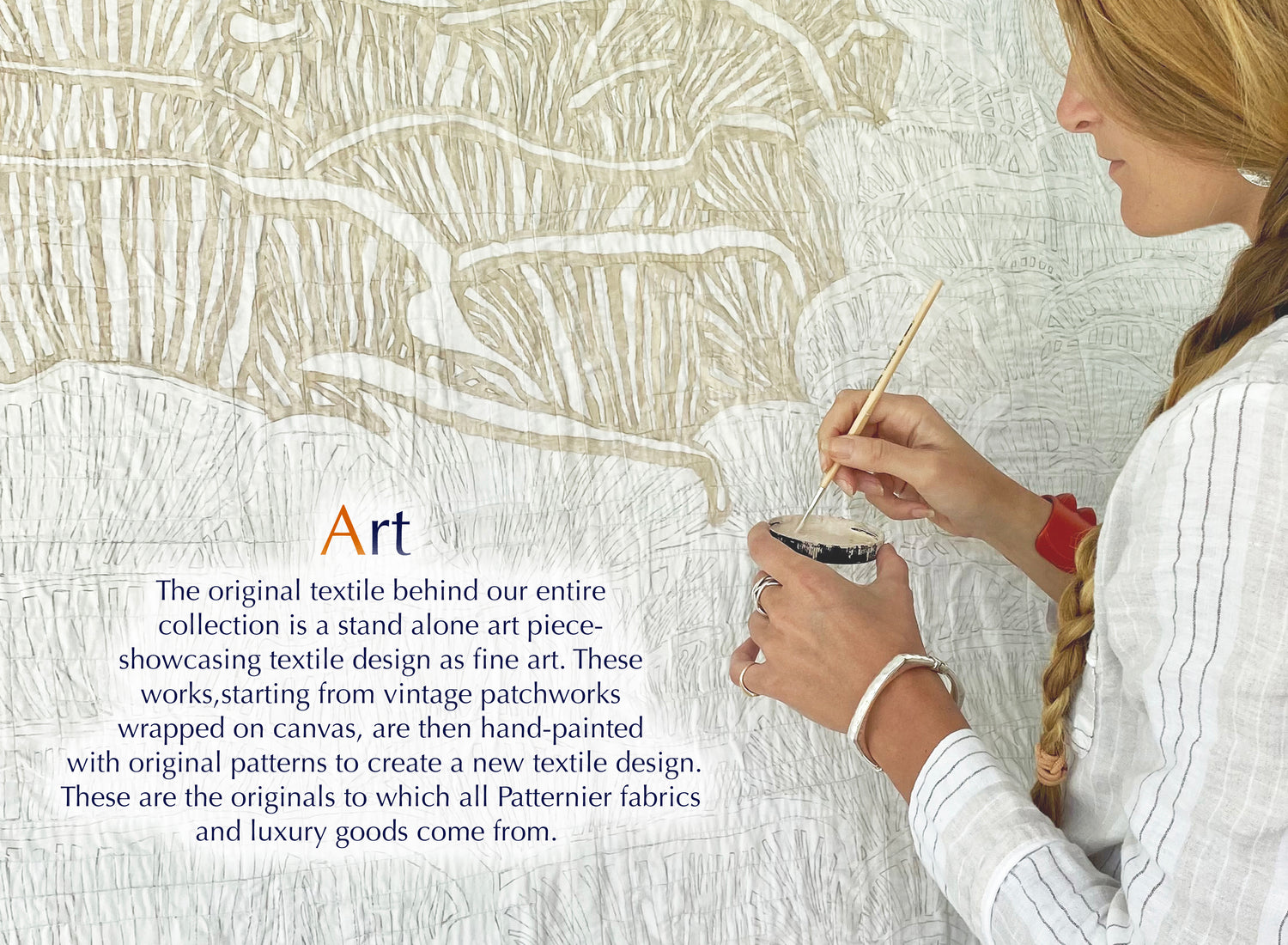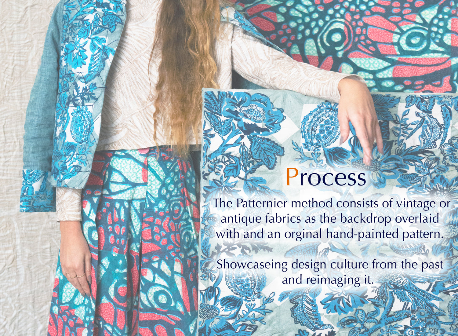 Patternier, the brainchild of Master Textile Designer, Heather Rose Rauscher, is a unique Art, Fashion, and Home company rooted in Textile Design. With a deep passion for vintage fabrics, which showcase design culture, Heather reimagines these pieces through her own lens. Using vintage quilts as the backdrop for her designs, she then hand-paints original patterns over the quilts to create a new textile design- and an original work of art. The new textile is then used to create unique home and fashion stylings. Pushing it one step further- all fashion pieces are created from vintage silhouettes which Heather sources herself. Using motifs that would not normally be put together, such as, a chinoiserie Jacobean on an Americana Patchwork, Heather somehow makes it work in a sophisticated and inventive way. Any item from Patternier is meant to stand alone as a work of art, not just a luxury good.