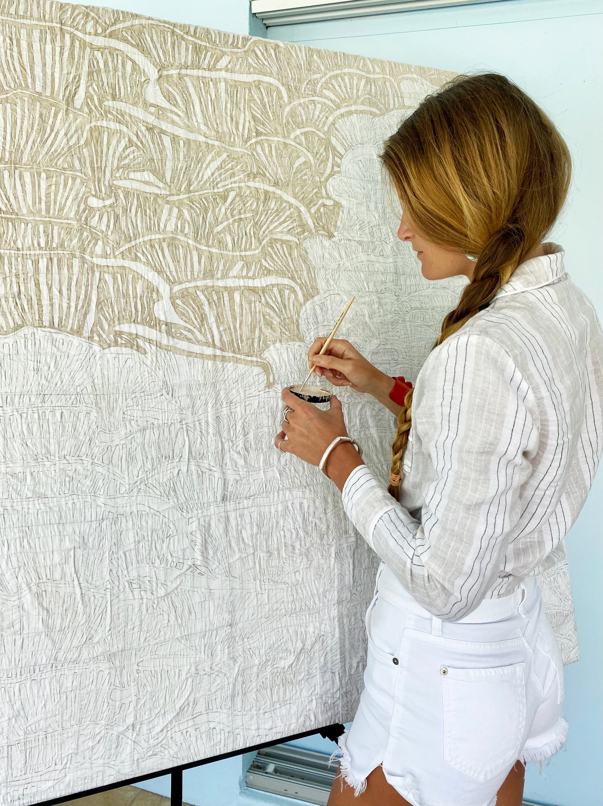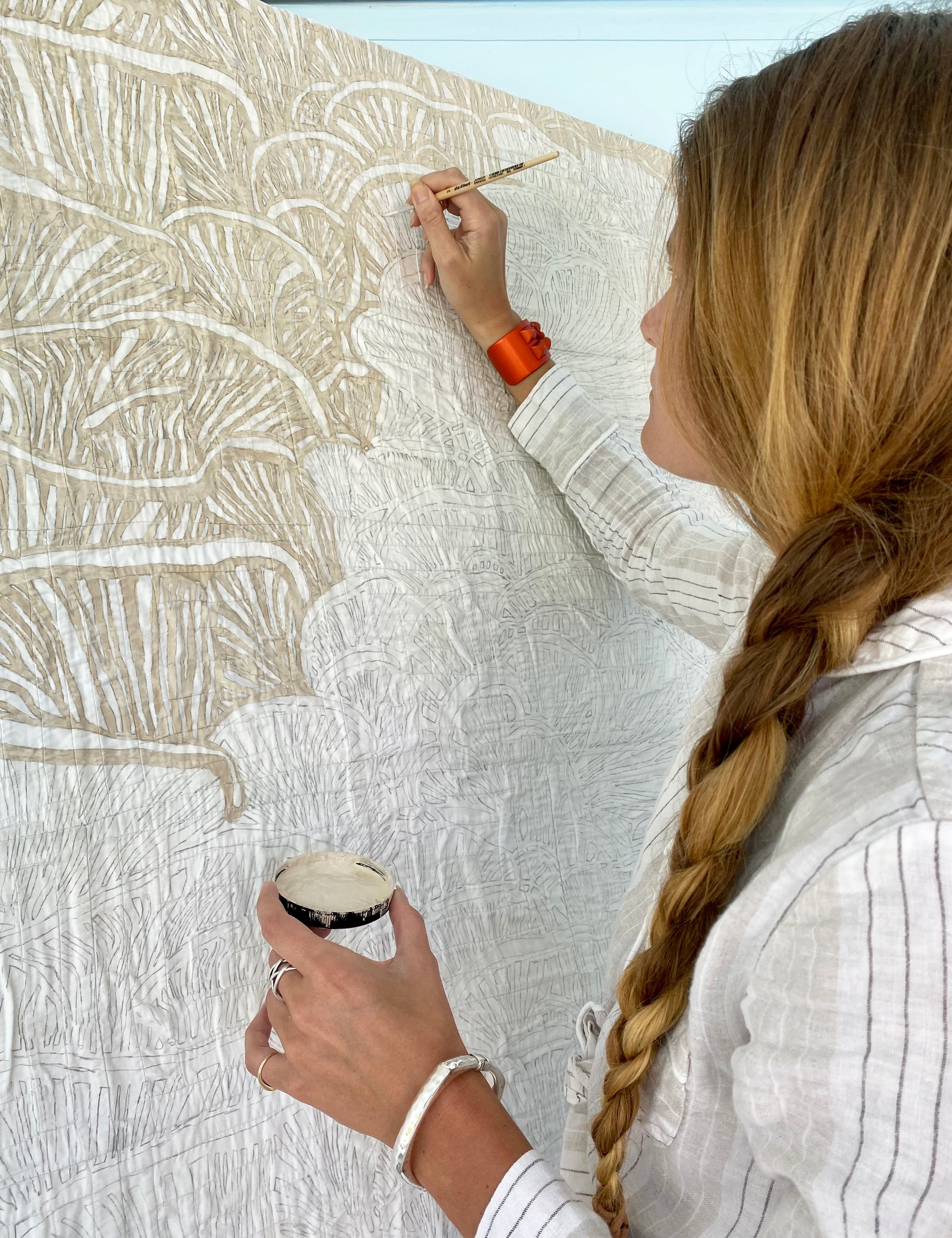 Hand-painted with Fabric Paint with original designs to create the Serene Maximalism Pattern