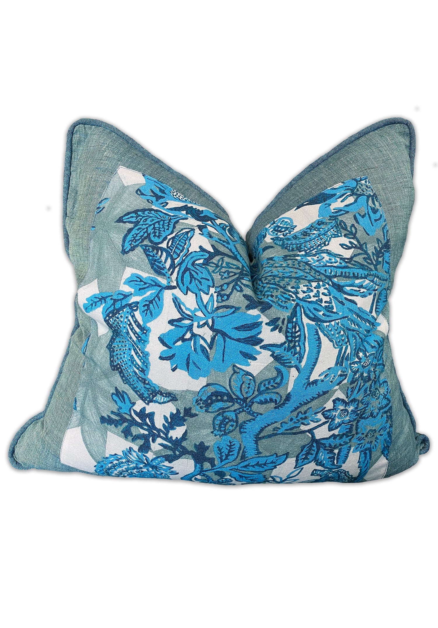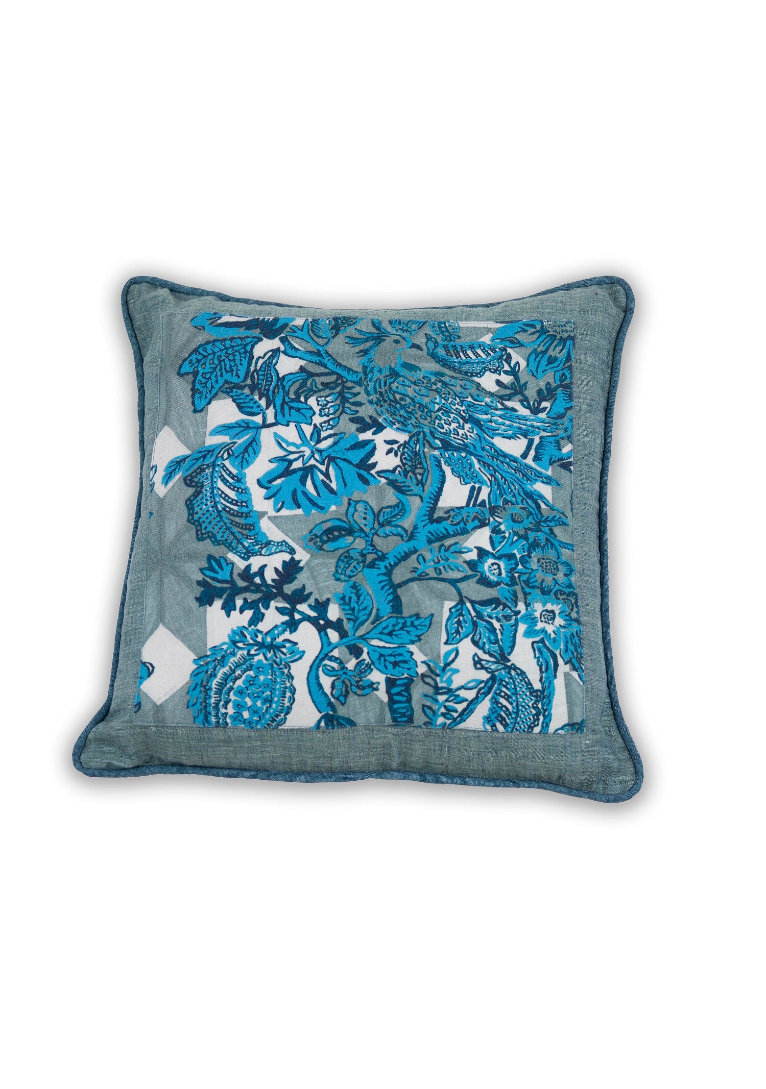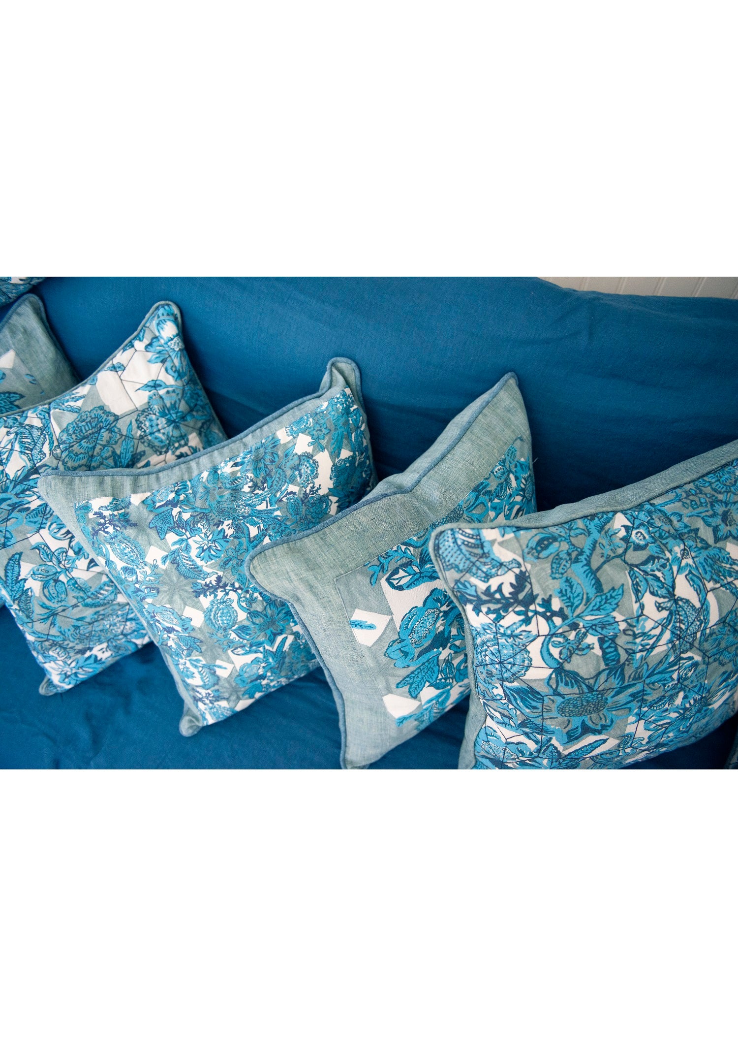 Whimsiculture Print appliqué on front, Linen Chambray behind appliqué and back of pillow.
